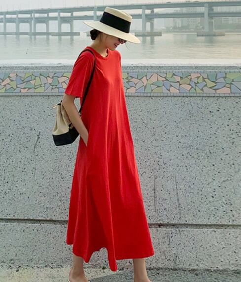 レディース ワンピース ロング マキシ 半袖 ラウンドネック コットン かわいい 大人可愛い シンプル カジュアル ラフ ガーリー ルーズ キュート ベーシック ナチュラル 清潔感 爽やか 涼しげ 女性らしい リラックス 無地 夏 20代 30代 40代 デート お出かけ イベント リゾート 旅行 レストラン 女子会 休日 バカンス ショッピング カフェ 食べ歩き ドライブ 水族館 お祭り 花火大会 韓国 普段使い 定番 S M L ゆったり 大きめ ブラック オフホワイト ブルー レッド