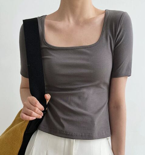 シックなカラーが魅力的な大人可愛い半袖カットソー。スクエアネックなのでデコルテラインが綺麗に見えて、顔周りをすっきりと見せてくれます。シンプルなので着回し力抜群。柄物のボトムスを合わせても可愛いです。