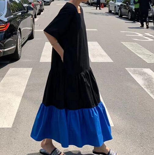 重ね着風のデザインがおしゃれなフェイクツーピースワンピース。ブラックのTシャツとブルーのスカートを着ているように見えますが、繋がっているのでこのワンピースを着るだけでコーディネートが決まります。シンプルなのでアクセサリーをプラスして華やかさをアップしても◎