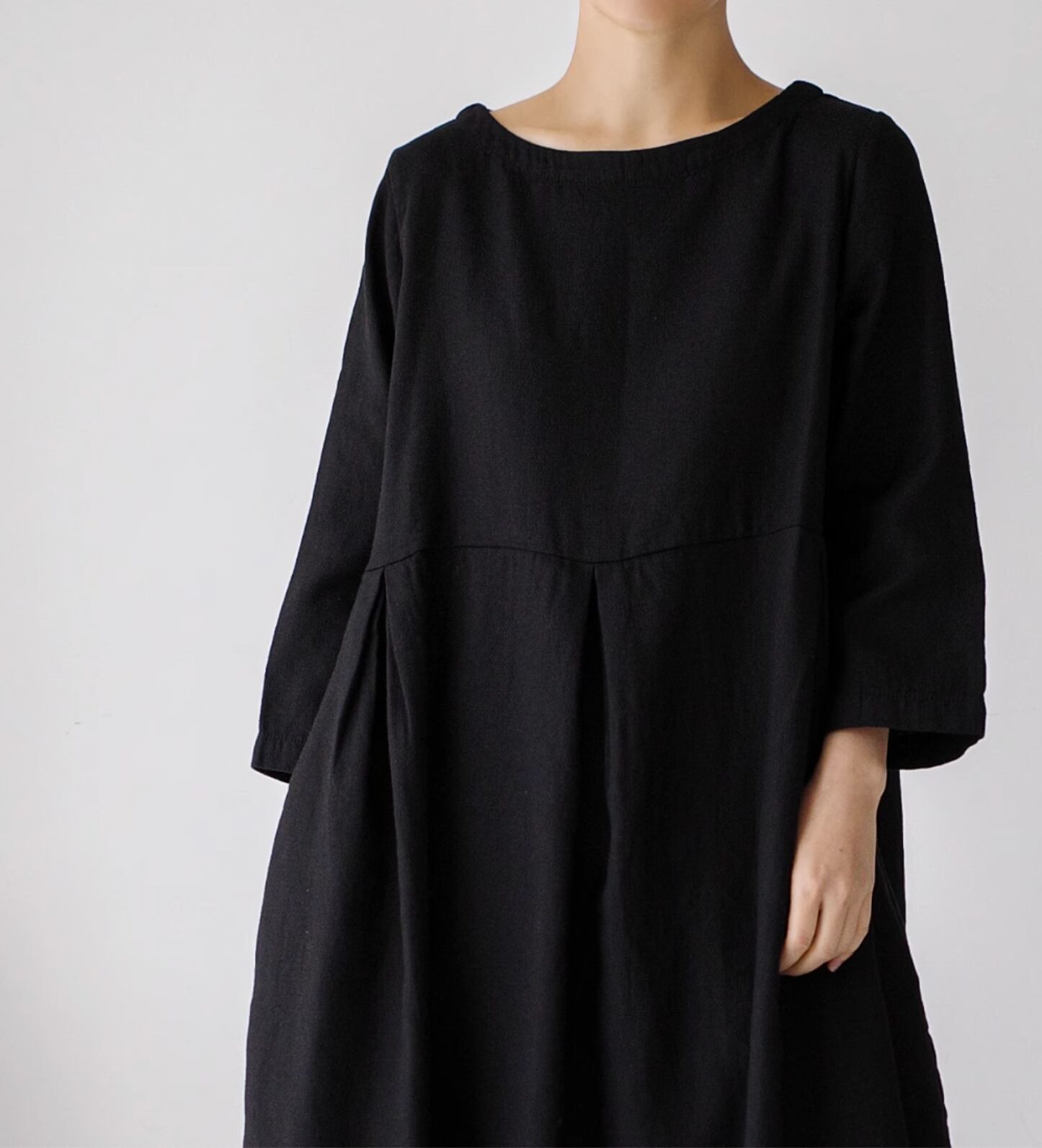 レトロな雰囲気が漂うロングワンピースです。女性らしいシルエットに加え、優れた着心地も魅力です。ラウンドネックとウエストのタックデザインにより、上品さと華やかさを兼ね備えています。素材には、上質なリネンコットンを使用し、肌触りも風合いも最高の一着です。