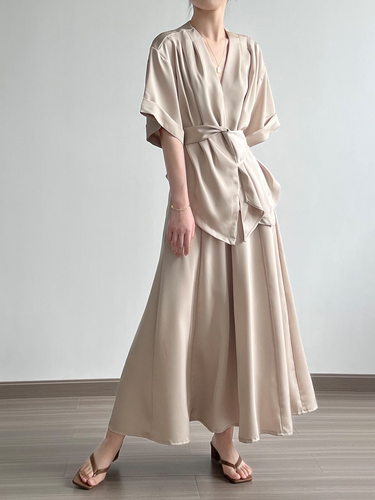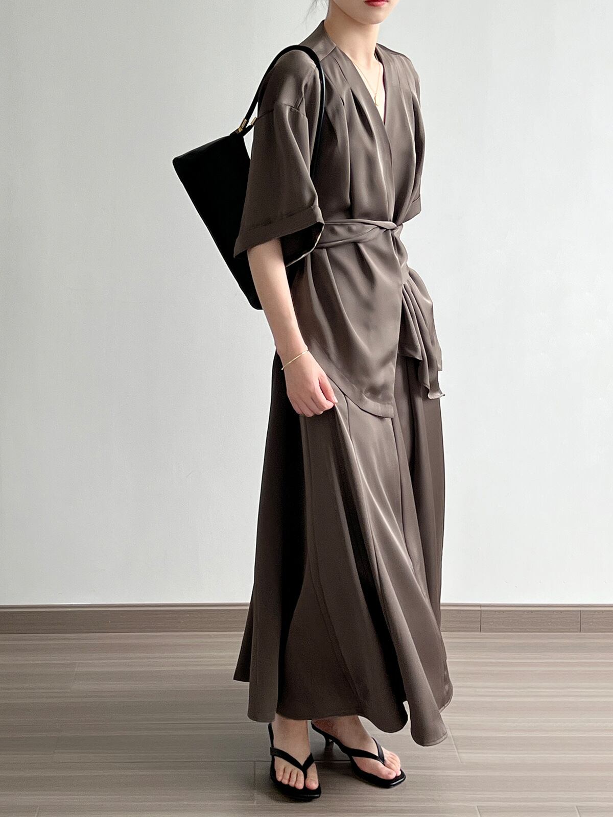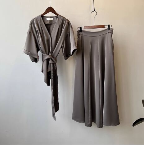 セットアップ 2点セット レディース スカート トップス シャツ ロング 半袖 合わせVネック Aライン ウエストリボン かわいい 大人可愛い きれいめ シンプル 上品 おしゃれ かっこいい レトロ こなれ感 個性的 クール エレガント とろみ感 抜け感 都会的 無地 夏 デート お出かけ 休日 コーデ 楽ちん 体型カバー 着回し M L ゆったり ゆる 黒 ブラック 茶色 ブラウン アプリコット