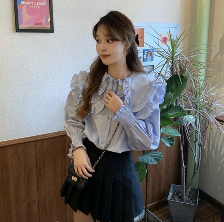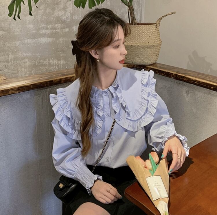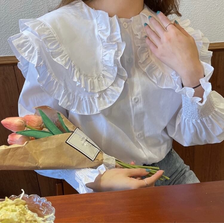 レディース トップス ブラウス 長袖 パフスリーブ ポエットスリーブ ビッグ襟 フェミニン フリル かわいい 大人可愛い きれいめ シンプル カジュアル 上品 おしゃれ レトロ ガーリー エレガント 抜け感 ラブリー キュート ロリータ プリンセス クラシカル ロマンティック 大人女子 清潔感 華やか 無地 春 秋 デート お出かけ 公園 女子会 休日 ガーデン ショッピング 合コン コンパ 韓国 オルチャン 普段使い 着回し モテ 清楚 デイリー ゆったり フリーサイズ ホワイト ブルー 2色展開