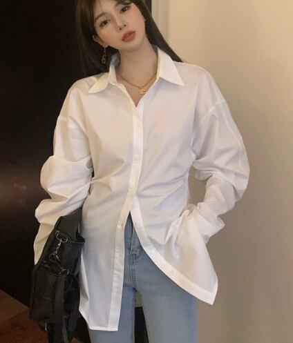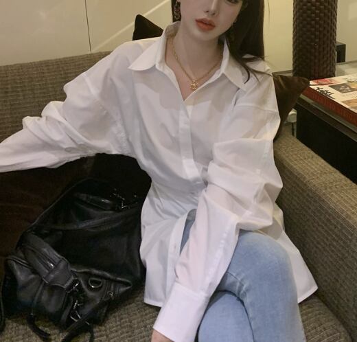 レディース トップス シャツ ミドル丈 長袖 ボリューム袖 襟付き 角襟 前開き かわいい シンプル カジュアル おしゃれ かっこいい こなれ感 ラフ メンズライク ボーイッシュ ルーズ クール キュート ベーシック ナチュラル シック 清潔感 爽やか リラックス ハンサム 無地 春 秋 10代 20代 30代 40代 50代 60代 デート お出かけ 休日 楽ちん 体型カバー 普段使い 着回し 冷房対策 日除け 日焼け防止 UV対策 S M L ビッグ ゆったり オーバーサイズ 大きめ ホワイト