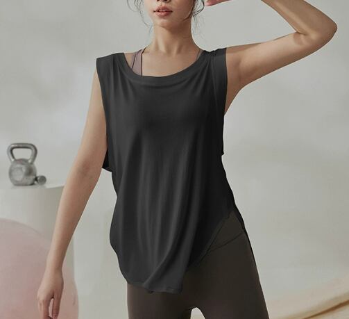 ヨガやストレッチなど体を動かす際にぴったりの通気性に優れたタンクトップ。お尻がすっぽりと隠れる長さなのも嬉しいポイント。シックなカラーなので大人女性にもおすすめです。