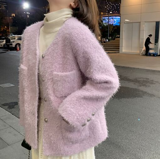 優しげで女性らしいパープルカラーが魅力的なノーカラーの長袖カーディガン。ゆったりとしたシルエットと高級感漂う生地がおしゃれで可愛いアイテムです。厚手なので寒い季節や夜のお出かけにもピッタリの一枚。ハイネックのトップスとの重ね着が◎