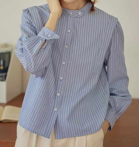 レディース トップス シャツ ミドル丈 長袖 スタンドカラー 前開き 異国風 かわいい 大人可愛い きれいめ カジュアル 上品 おしゃれ かっこいい レトロ メンズライク マニッシュ ボーイッシュ クール キュート カントリー ナチュラル シック 高級感 清潔感 爽やか 優しい 知的 スタイリッシュ ハンサム ストライプ 春 秋 20代 30代 40代 50代 60代 オフィス OL デート お出かけ イベント 旅行 休日 ショッピング お花見 カフェ 美術館 普段使い 着回し 清楚 S M ブルー