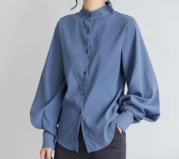 ふんわりとしたボリューム感のある袖がおしゃれな長袖のスタンドカラーシャツ。シックなカラーが大人女性にぴったりです。シンプルなので着回し力抜群のアイテム。スマートなボトムスやフレアスカートと相性抜群です。