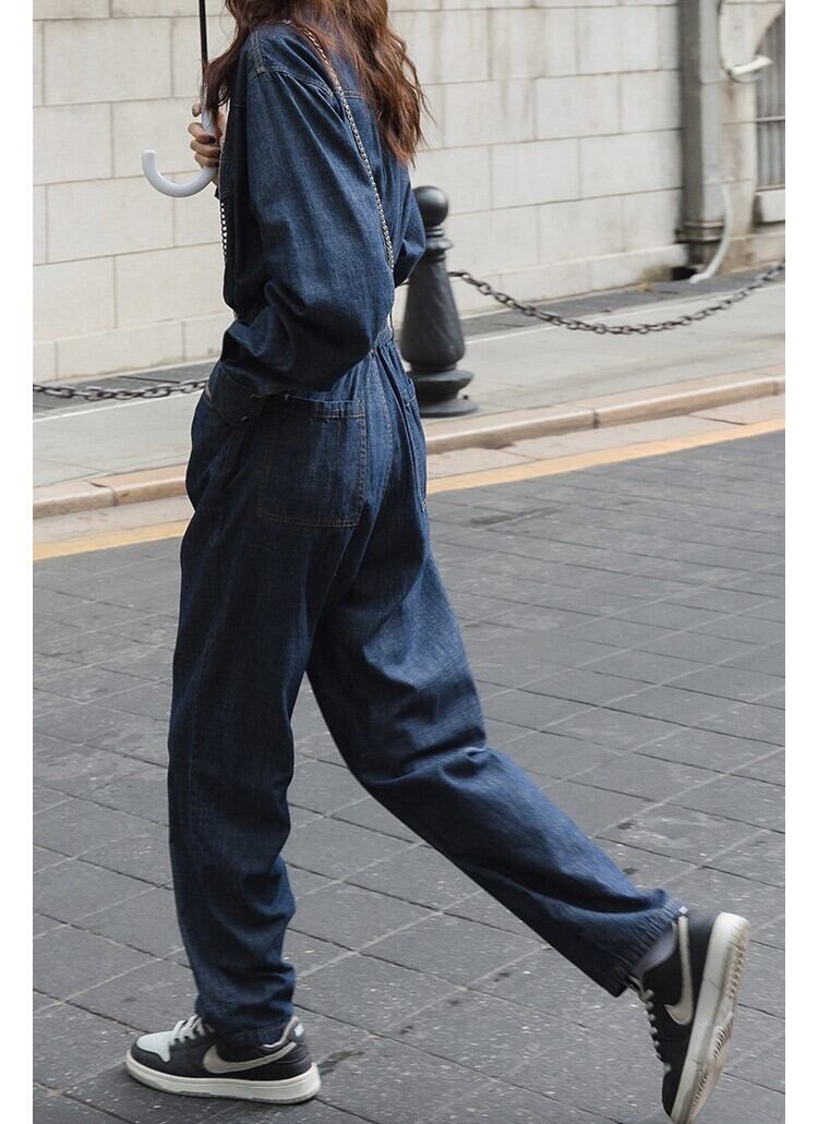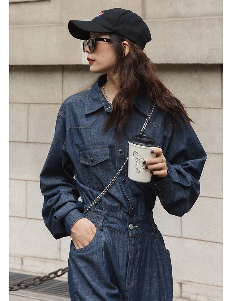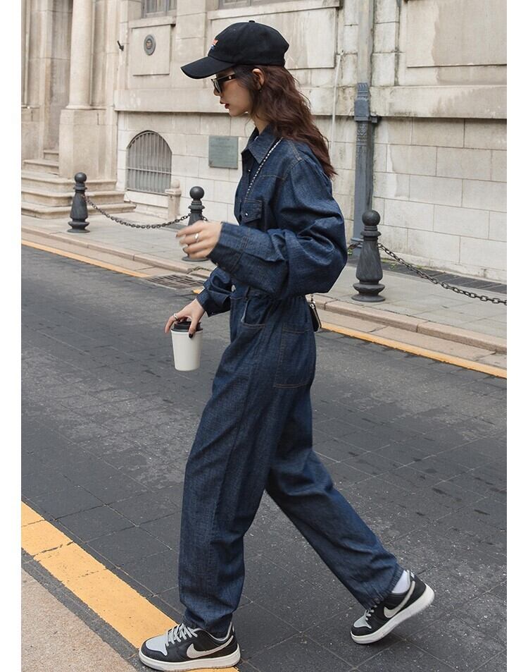 デニムつなぎ ジャンプスーツ レディース オールインワン 膝下 ロング マキシ 長袖 ドロップショルダー 襟付き Iライン ポケット ハイウエスト 前開き バックウエストゴム ベルト通し付き デニム シンプル カジュアル 上品 おしゃれ かっこいい こなれ感 ラフ メンズライク ベーシック アメリカン 無地 春 秋 冬 ママ 女の子 学生 学校 通学 お出かけ 旅行 公園 休日 ライブ カフェ フェス 重ね着 韓国 オルチャン コーデ 楽ちん 体型カバー 脚長 普段使い 定番 S M L ゆったり ブルー