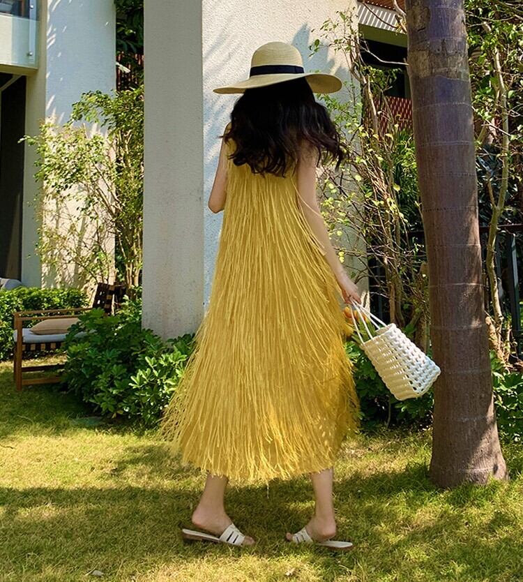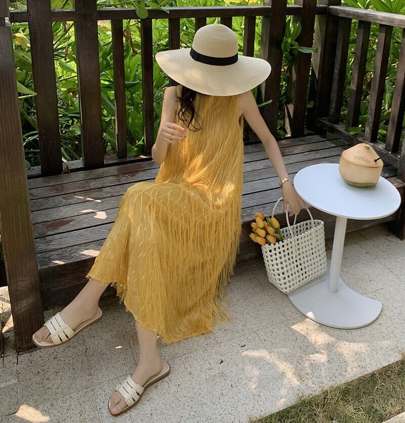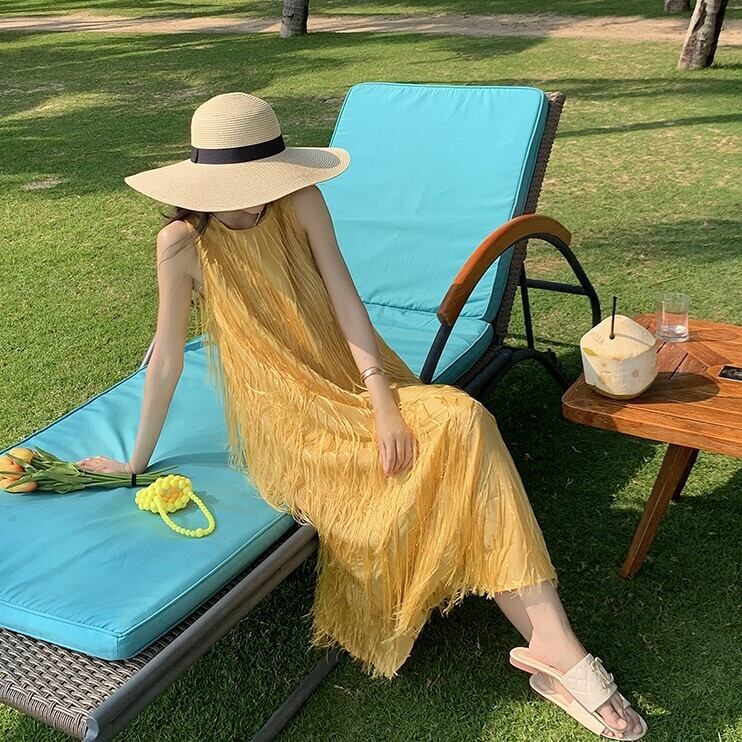フリンジ装飾 サマードレス リゾートワンピ レディース ワンピース 膝下 ミモレ ミディアム丈 袖なし ノースリーブ ラウンドネック 襟なし Aライン 透け感 かわいい 大人可愛い きれいめ シンプル カジュアル 上品 おしゃれ こなれ感 個性的 存在感 抜け感 無地 夏 ママ 女の子 デート お出かけ イベント リゾート 旅行 海 ビーチ 女子会 休日 バカンス 重ね着 韓国 オルチャン コーデ 楽ちん 体型カバー 普段使い 着回し レイヤード インスタ映え S M L XL 黄色 イエロー きれい色