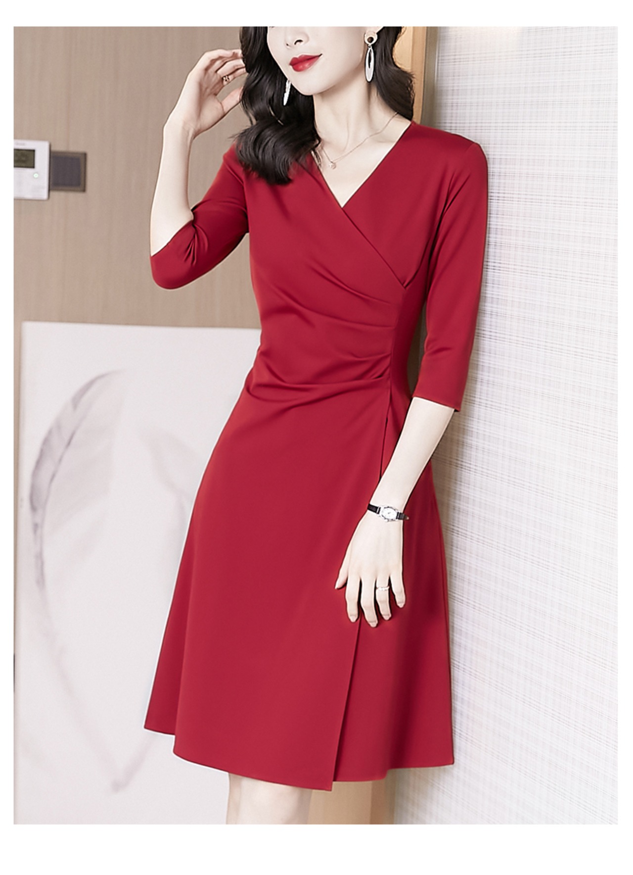 レディース ワンピース ショート 膝丈 7分袖 Vネック 合わせVネック スリム Aライン ラップ 巻きスカート風 ハイウエスト 大人可愛い きれいめ シンプル 上品 おしゃれ かっこいい クール フォーマル かっちり 無地 春 秋 冬 発表会 冠婚葬祭 デート お出かけ ホテル 発表会 コーデ 楽ちん 清楚 S M L XL 2XL 3XL 黒 ブラック ワインレッド