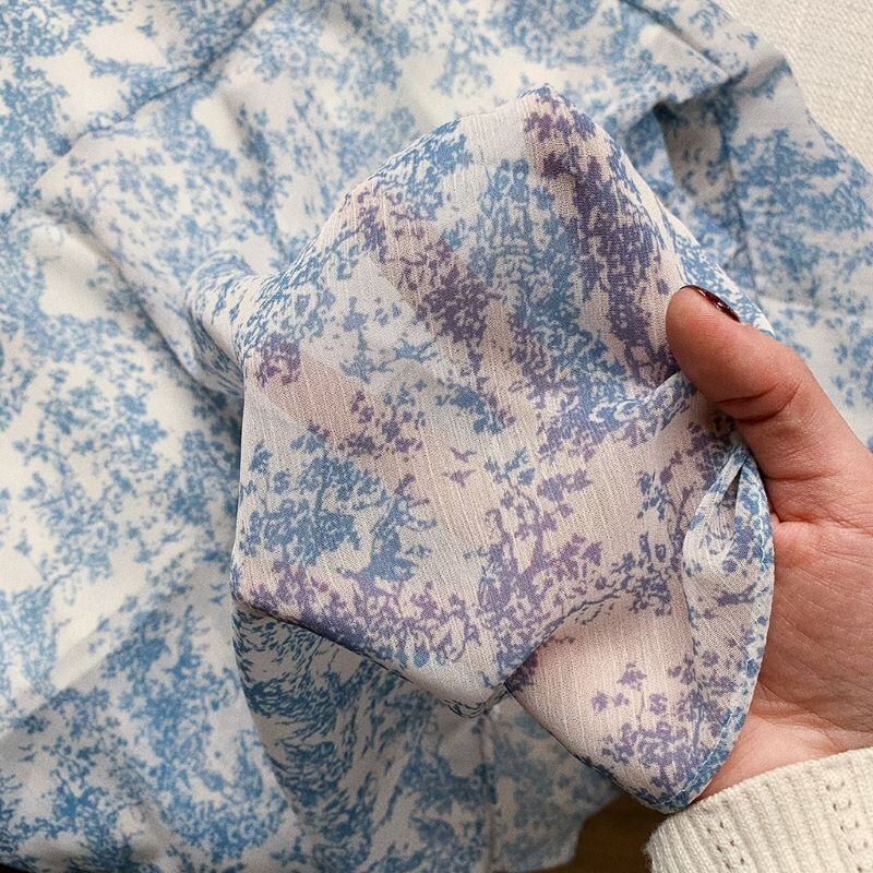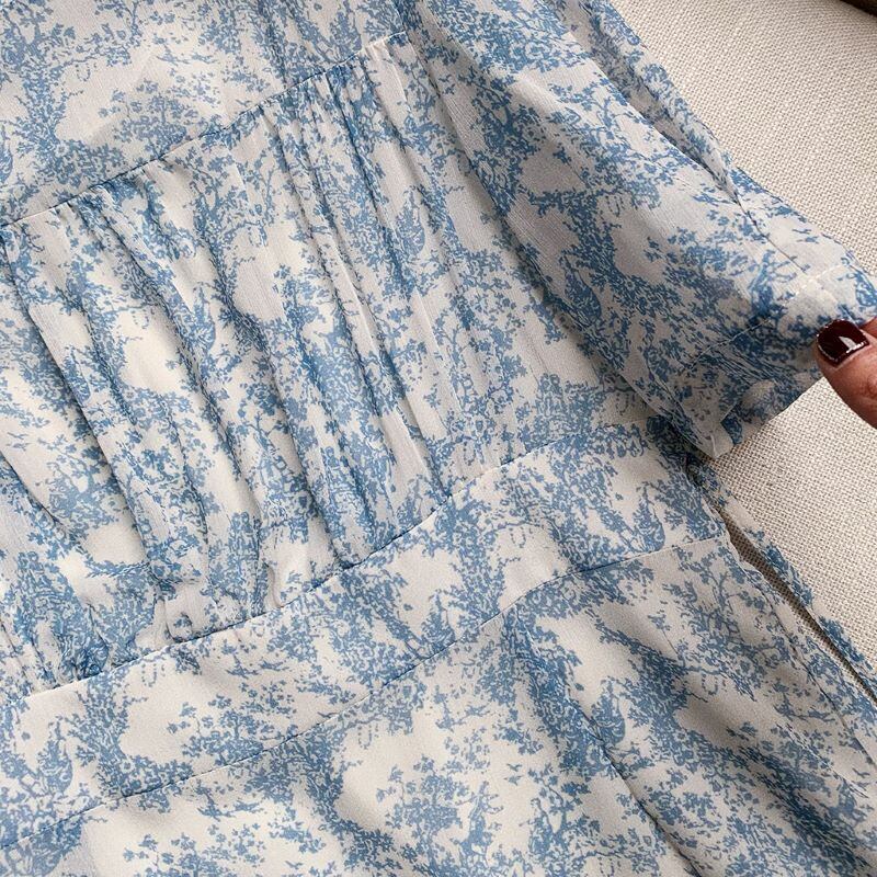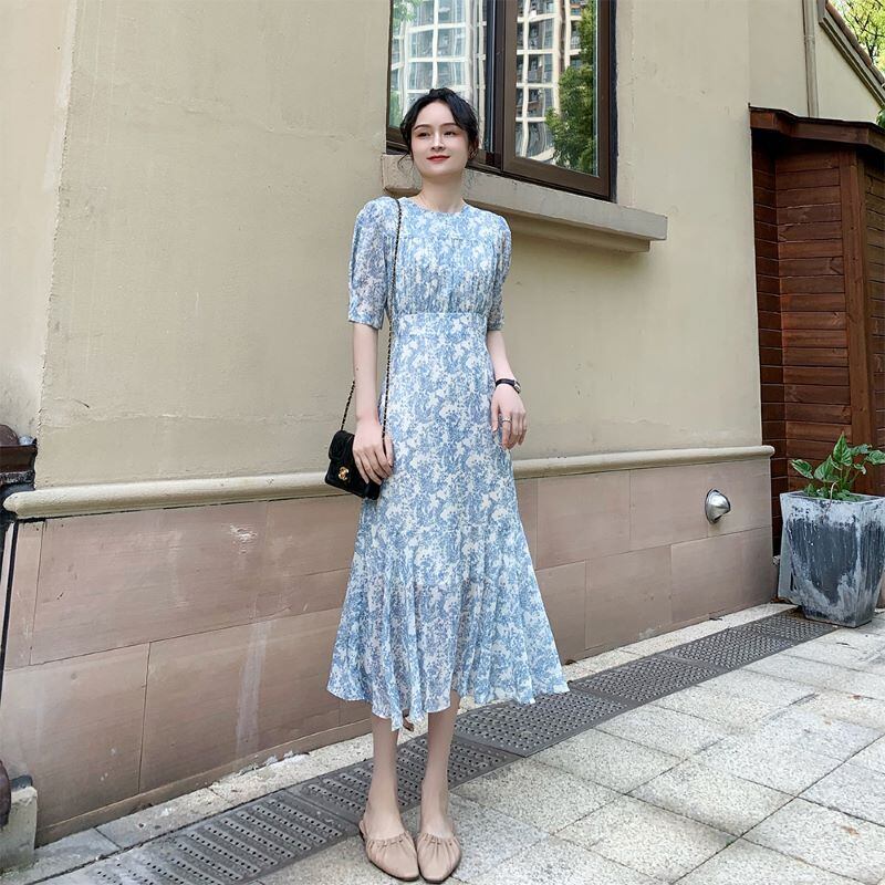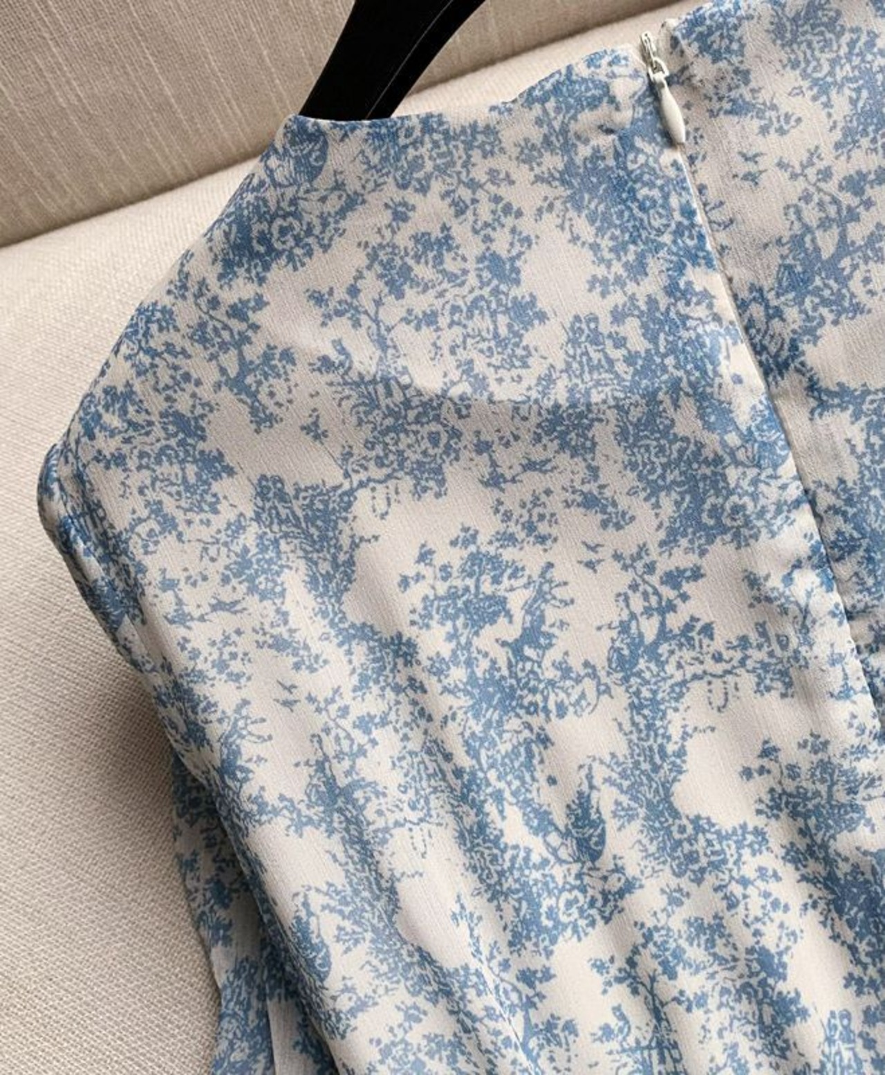 ブルーのフローラルプリントが爽やかな印象の五分袖ワンピース。胸上のギャザーが女性らしさを引き立て、裾のフレア切り替えが雰囲気あるシルエットを演出するデザインです。裏地のない袖や裾付近にはやや透け感があって軽やかに決まるのも魅力。バックウエストで細いリボンを結ぶハイウエストデザインで、スタイルアップ効果も抜群。