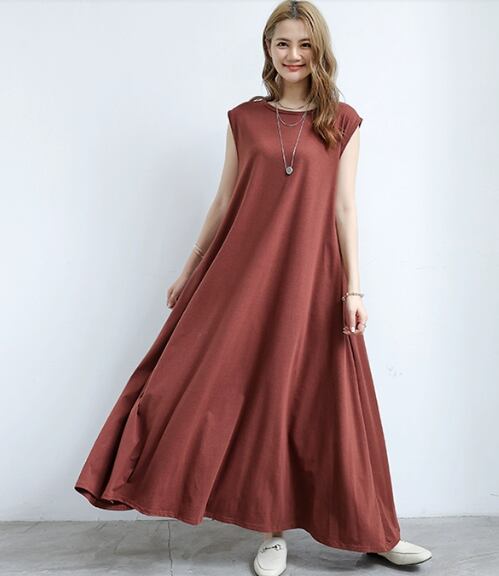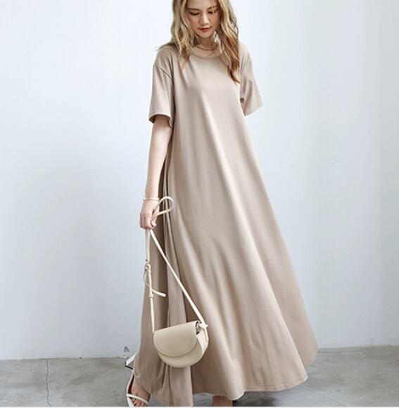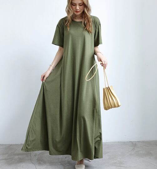 豊富なカラー展開が魅力的な半袖のマキシ丈ワンピース。ゆったりとした作りになっているのでマタニティウェアとしての着用にもおすすめです。シックなカラーが大人女性にぴったり。涼しげで夏にぴったりのアイテムです。