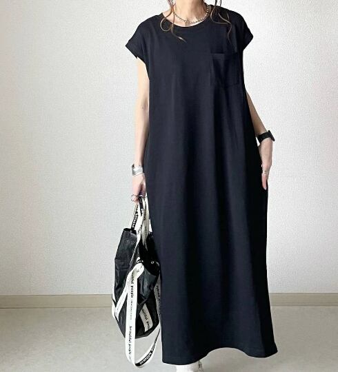 ゆったりとしたシルエットがおしゃれな半袖のアンクル丈ワンピース。そのまま着ても可愛いですが、下にパンツを忍ばせるのがおすすめ。さらに足元にサンダルを添えれば大人可愛い夏コーデが完成します。さりげないサイドスリットもアクセントになっていて可愛いです。