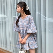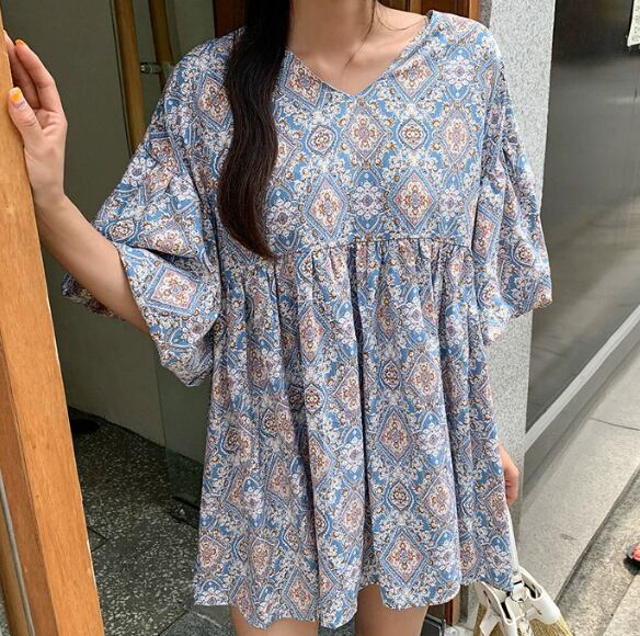 レディース トップス プルオーバー チュニック ロング 5分袖 ボリューム袖 ランタンスリーブ Vネック Aライン ふわふわ ふっくら 異国風 かわいい 大人可愛い カジュアル 上品 おしゃれ エスニック ラフ ガーリー ルーズ エレガント キュート ラグジュアリー シック 高級感 芸術的 清潔感 爽やか プリント 春 夏 10代 20代 30代 40代 50代 デート お出かけ 楽ちん 体型カバー 普段使い 着回し モテ S M L XL ビッグ ゆったり オーバーサイズ 大きめ ネイビー ライトブルー