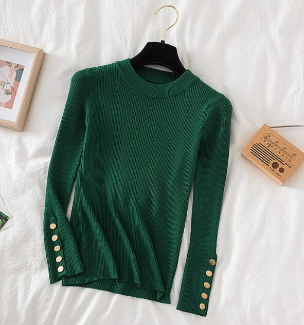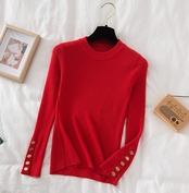 豊富なカラーラインナップが魅力的な長袖のニットセーター。袖についた金ボタンがアクセントになっていて可愛いアイテムです。シンプルなので着回し力抜群。柄物のボトムスを合わせても◎