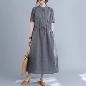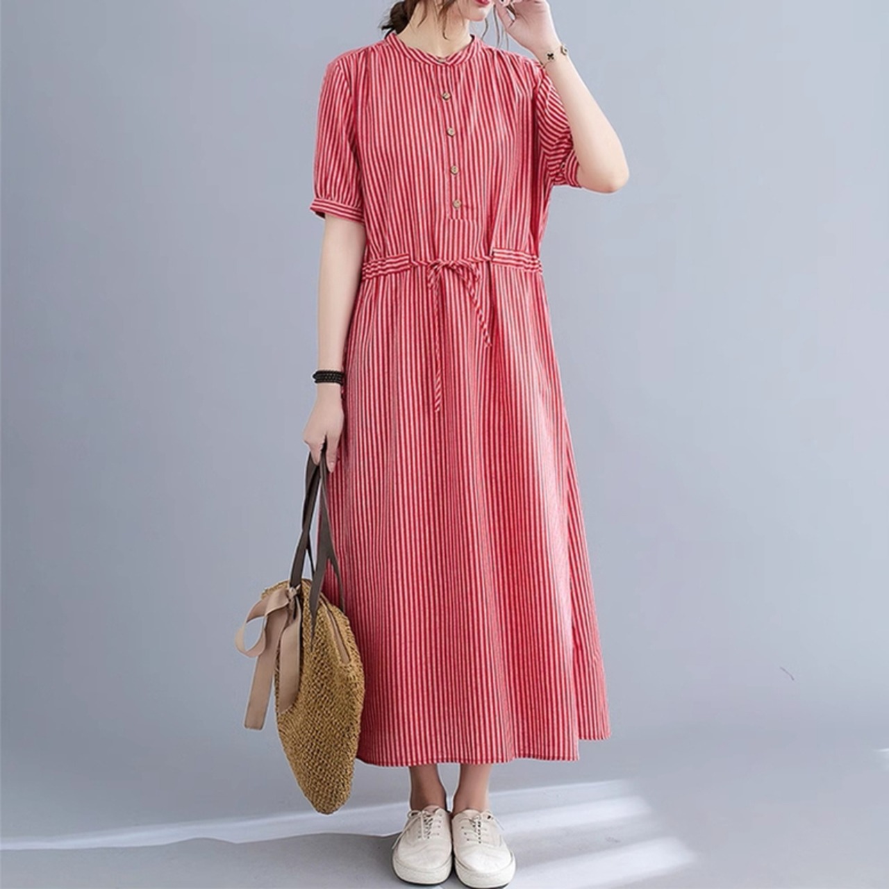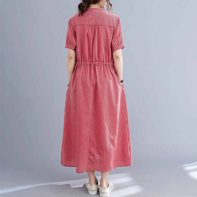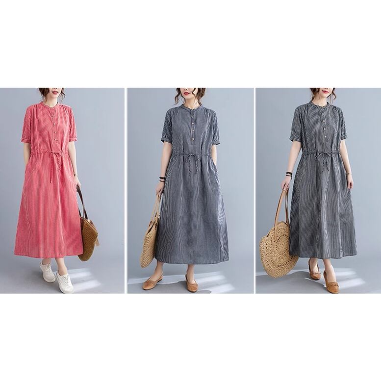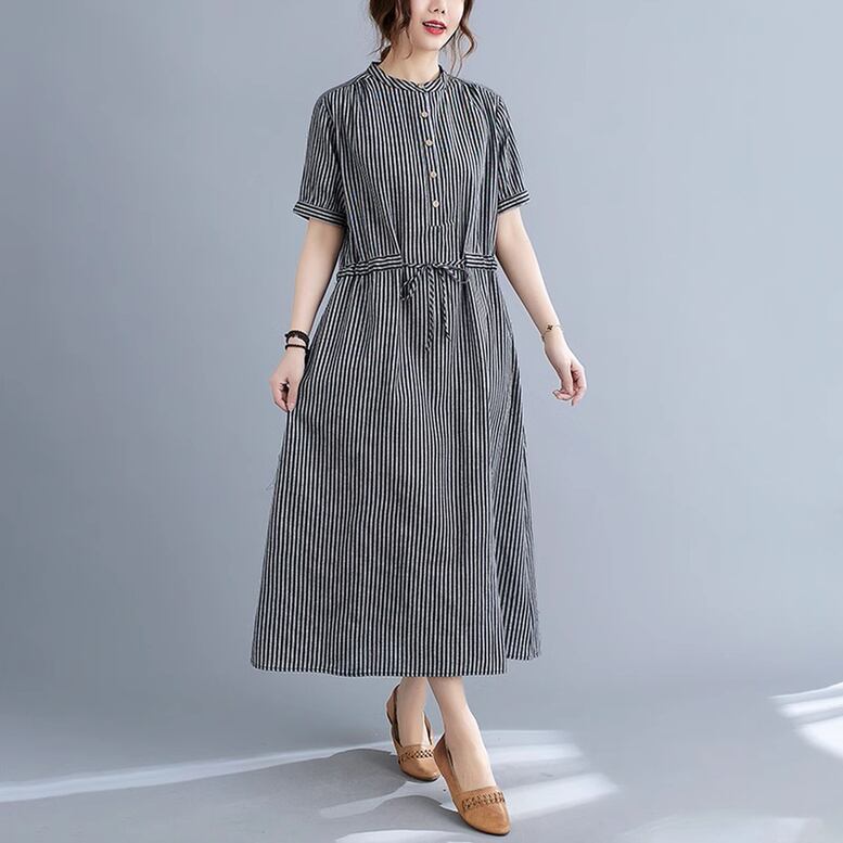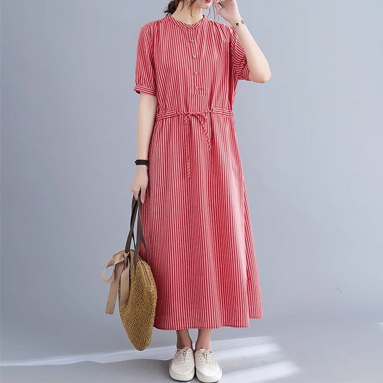ストライプ柄ロングワンピース レディース ワンピース ストライプ柄 ノーカラーワンピース シャツワンピース ロングワンピース 半袖 クルーネック ロング丈 ミモレ丈 ウエストリボン オシャレ シンプル 可愛い キレイめ 上品 フェミニン カジュアル デイリー おでかけ オンオフ兼用 公園コーデ アウトドア 普段着 定番 ベーシック 王道 万能 機能性 スマート 細見え スタイルアップ 高見え 新鮮 主役級 鮮度アップ ゆったり 体型カバー トレンド
