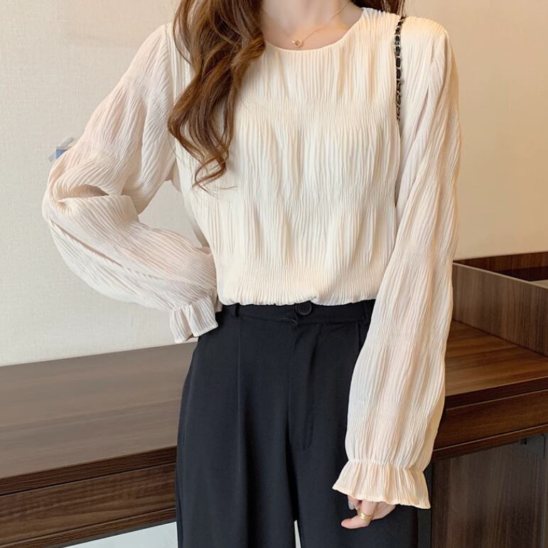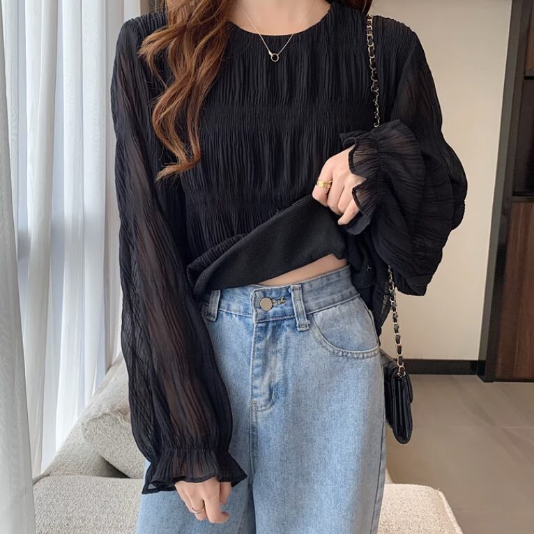 レディース トップス シャツ ブラウス 長袖 ボリューム袖 パフスリーブ 萌袖 ラウンドネック 襟なし ノーカラー ストレート フェミニン シフォン 透け感 シースルー 異国風 薄手 かわいい 大人可愛い きれいめ シンプル カジュアル 上品 おしゃれ レトロ アジアン こなれ感 ラフ ガーリー ルーズ 個性的 エレガント モダン 主役級 存在感 とろみ感 抜け感 ベーシック ロマンティック ナチュラル 無地 春 秋 楽ちん 体型カバー 普段使い モテ 清楚 M L XL 2XL 3XL 4XL ゆる