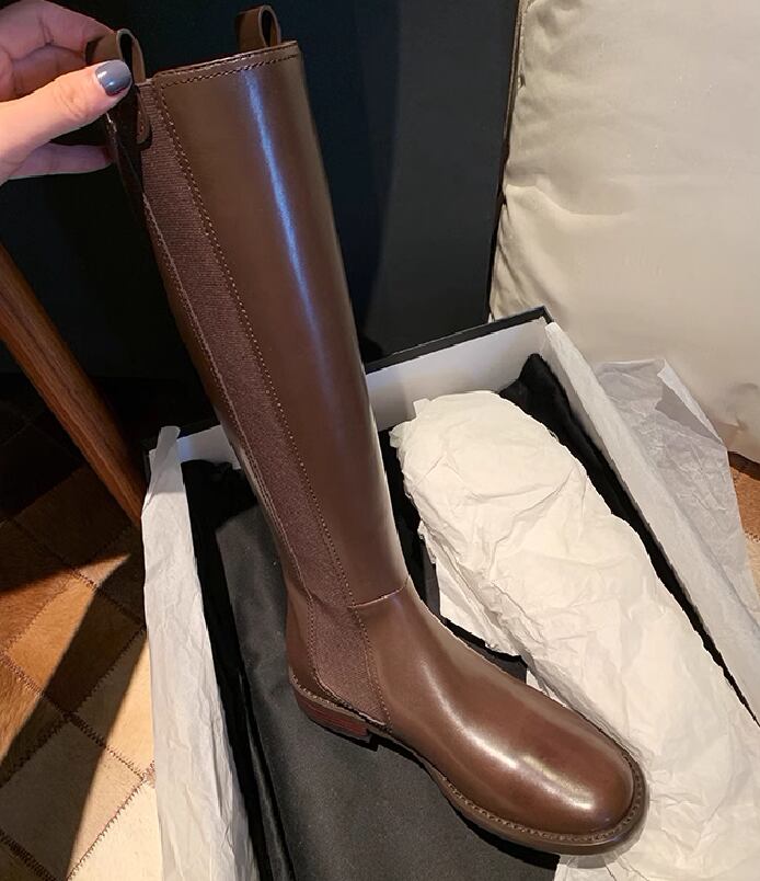 レディース ブーツ ロングブーツ ローヒール ラウンドトゥ 美脚 脚長 レザー サイドゴム かわいい 大人可愛い きれいめ シンプル カジュアル 上品 おしゃれ かっこいい レトロ ガーリー クール 無地 冬 デート お出かけ 休日 デイリー 普段使い コーデ スタイル 高見え モテ 黒 茶色 ブラック ブラウン