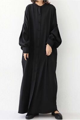 多機能なワンピースルームウェアドレスが登場しました!このマキシ丈のワンピースは、ドルマンスリーブとラウンドネックが特徴で、シンプルかつカジュアルなデザインです。ポケットと前開きのボタンも付いており、使い勝手も抜群です。