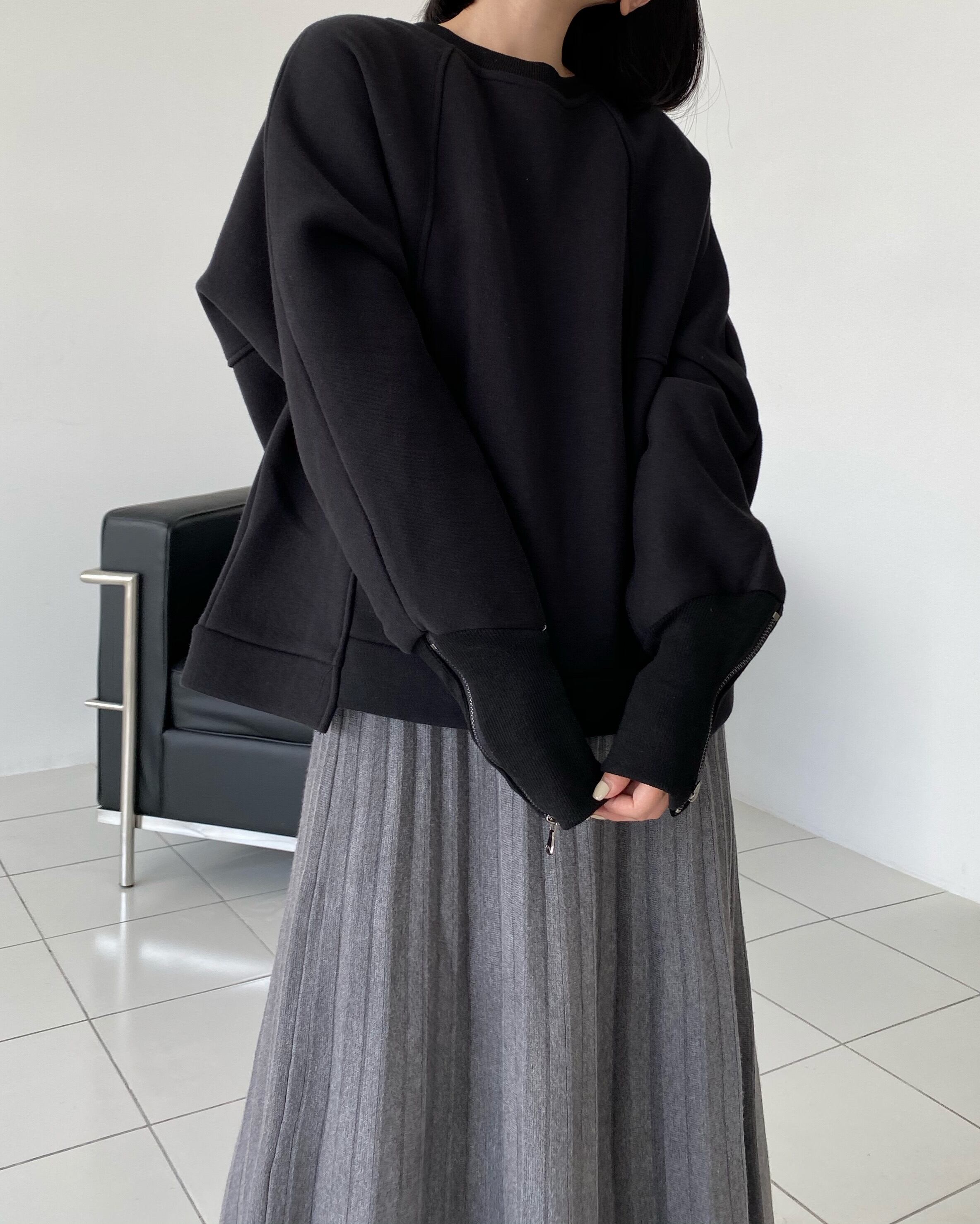 ミドル丈のトップスが新登場しました!ドロップショルダーと袖ファスナーのデザインがトレンド感を演出し、あなたのおしゃれ度を上げてくれます。ラウンドネックで首元をすっきりと見せ、ストレートシルエットが余裕のあるカジュアルスタイルを叶えます。着心地も抜群で、ゆったりとしたサイズ感がリラックス感を与えてくれます。重たくなりがちな秋冬のスタイリングにも軽やかさをプラスしてくれますよ。