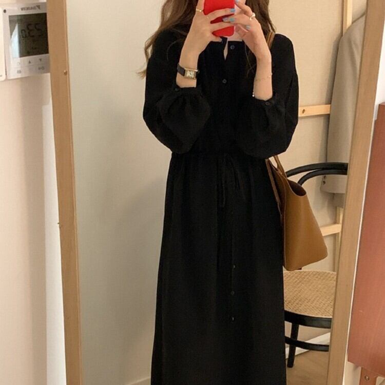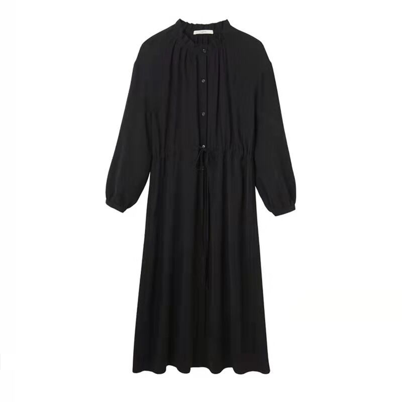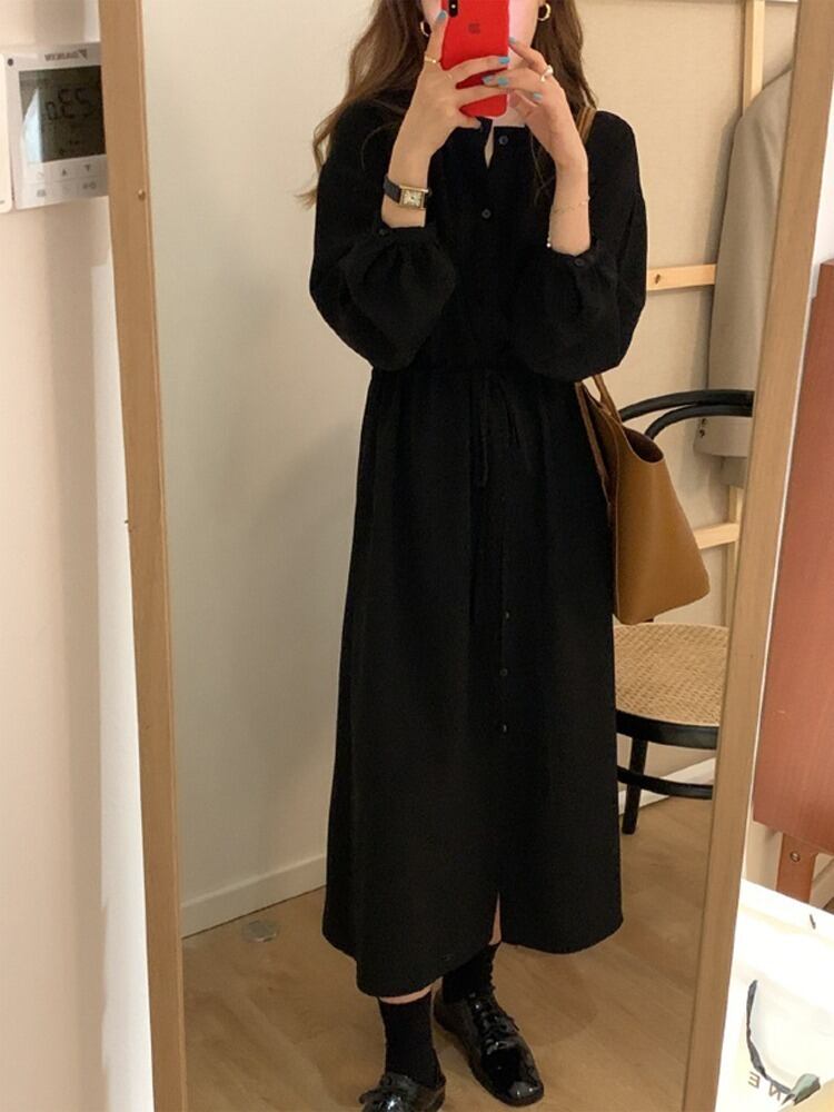 ウエストドロスト レディース ワンピース シャツワンピ 膝下 ミモレ ミディアム丈 長袖 ドロップショルダー 襟付き スタンドカラー ギャザーネック Aライン ウエストマーク 前開き ドロスト フロントボタン きれいめ シンプル カジュアル 上品 おしゃれ こなれ感 大人っぽい シック 無地 春 秋 ママ 女の子 OL 通勤 学生 学校 通学 デート お出かけ 女子会 休日 ショッピング お花見 カフェ 重ね着 楽ちん 体型カバー 普段使い 着回し XS S M L XL ゆったり ブラック モノトーン