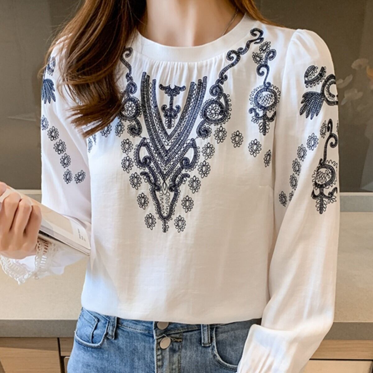 トップス ブラウス プルオーバー 長袖 ラウンドネック レース 刺繡 かわいい 大人可愛い きれいめ カジュアル ガーリー ルーズ 個性的 モード系 モダン 主役級 存在感 とろみ感 抜け感 キュート クラシカル カレッジ風 学生風 ベーシック アメリカン カントリー ロマンティック ナチュラル 春 夏 秋 ロングシーズン 学生 通学 デート お出かけ イベント リゾート 海 プール レストラン ビーチ 女子会 ホテル ライブ カフェ 韓国 オルチャン コーデ S M L XL 2XL ホワイト