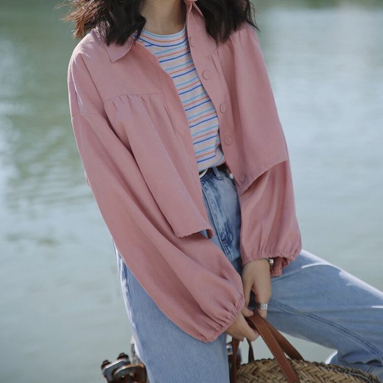 クロップドシャツジャケット レディース ライトアウター トップス ジャケット シャツジャケット クロップドジャケット 襟付き ボタン 長袖 バルーンスリーブ ショート丈 オシャレ シンプル 可愛い キレイめ 上品 フェミニン カジュアル デイリー おでかけ 公園コーデ アウトドア 普段着 ミニマム コンパクト スマート 細見え スタイルアップ 高見え 新鮮 主役級 鮮度アップ 上級者 オーバーサイズ ゆったり 体型カバー インスタ映え トレンド ガー