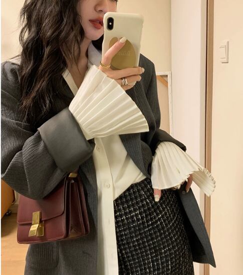 シックなカラーとふわりと広がるベルスリーブがおしゃれで大人可愛い長袖シャツ。前開きタイプなのでそのまま着ても可愛いですし柄物のワンピースの上にふわっと羽織ってもおしゃれ。ジャケットの袖口からベルスリーブを出して着るのも可愛い着こなし術です。