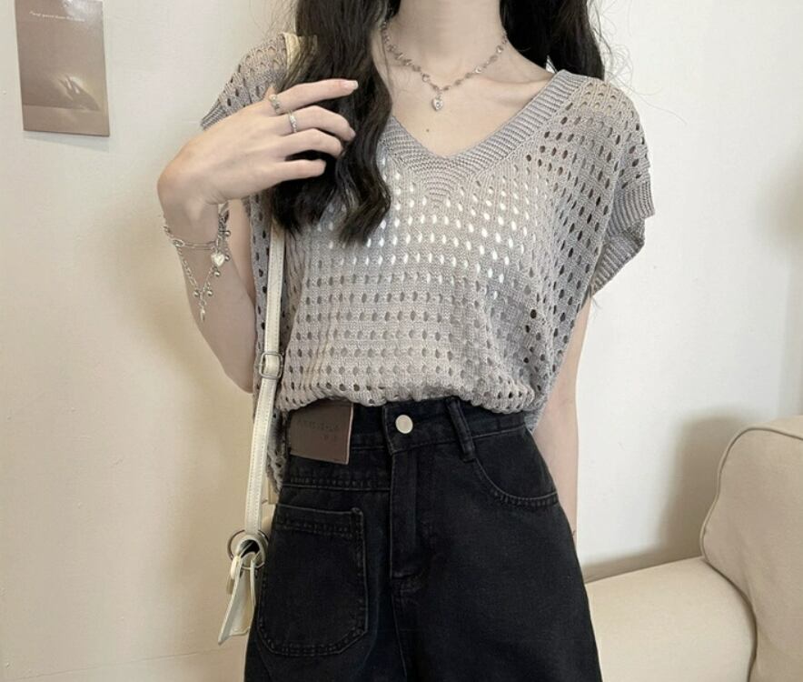 透かし編みニット レディース トップス ニット プルオーバー 半袖 Vネック 伸縮性 伸縮性 ポリエステル かわいい 大人可愛い シンプル カジュアル おしゃれ こなれ感 存在感 無地 春 夏 秋 お出かけ 旅行 休日 重ね着 コーデ 楽ちん 普段使い 着回し レイヤード S M L XL 白 ホワイト 黒 ブラック グレー カーキ アプリコット