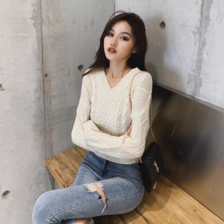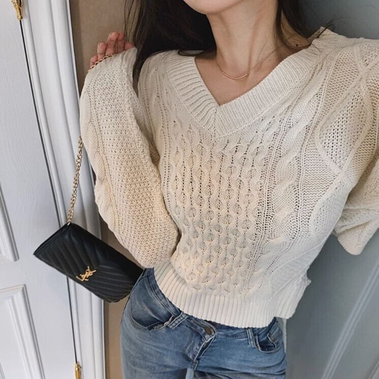 女性らしさを引き立てるバックリボンデザインのオーバーサイズセーター。ショート丈のアンバランスヘムデザインで後ろ裾がより短めになっており、1枚で着た時に後ろの裾付近は素肌が見えるセクシーな着こなしに。前から見るとシンプルなケーブル編みのクロップドニットで身幅ゆったりめですが、後ろリボンを結ぶことでウエスト周りはすっきりとしたシルエットになります。