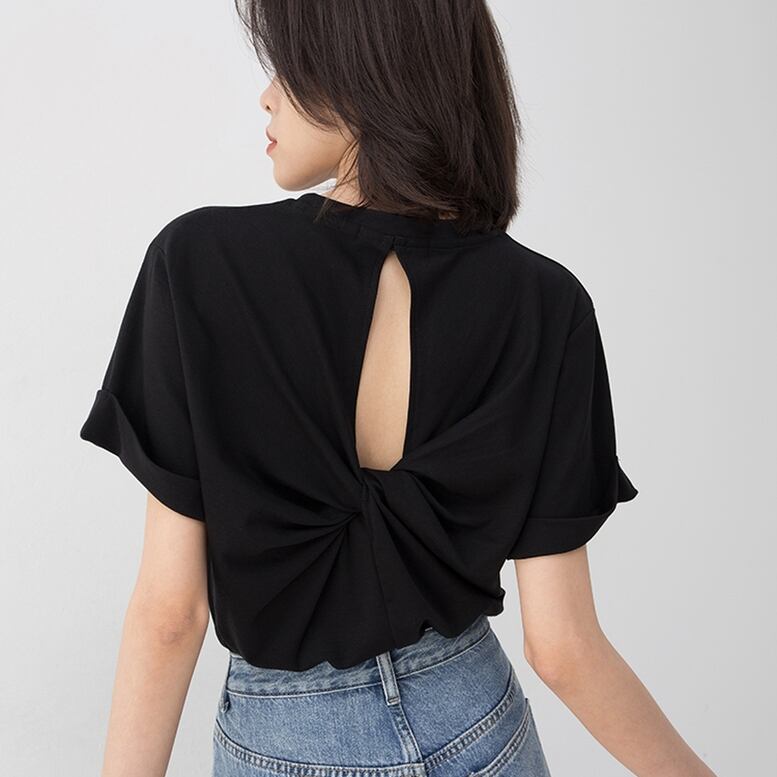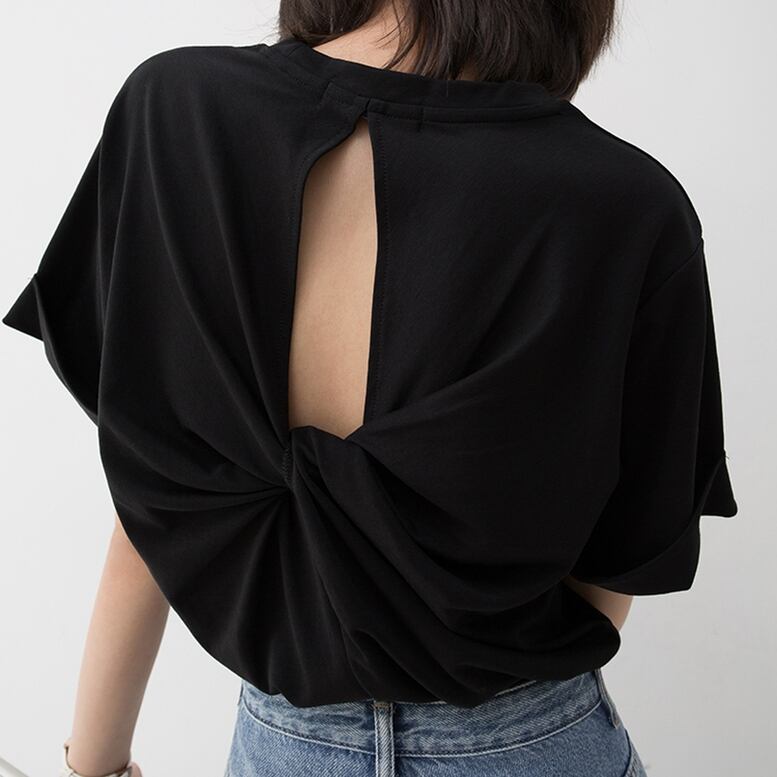 お洒落なコーディネートにぴったりのバックオープンツイストTシャツが登場しました!背中のツイストデザインが特徴で、女性らしい上品さとカジュアルさを兼ね備えています。無地でシンプルながらも、一枚で主役級の存在感を放つことができるアイテムです。女性らしさやフェミニンさを引き立てるだけでなく、体をカバーして細見え効果も期待できます。デイリーからオシャレなお出かけまで幅広いシーンで活躍すること間違いなしです。