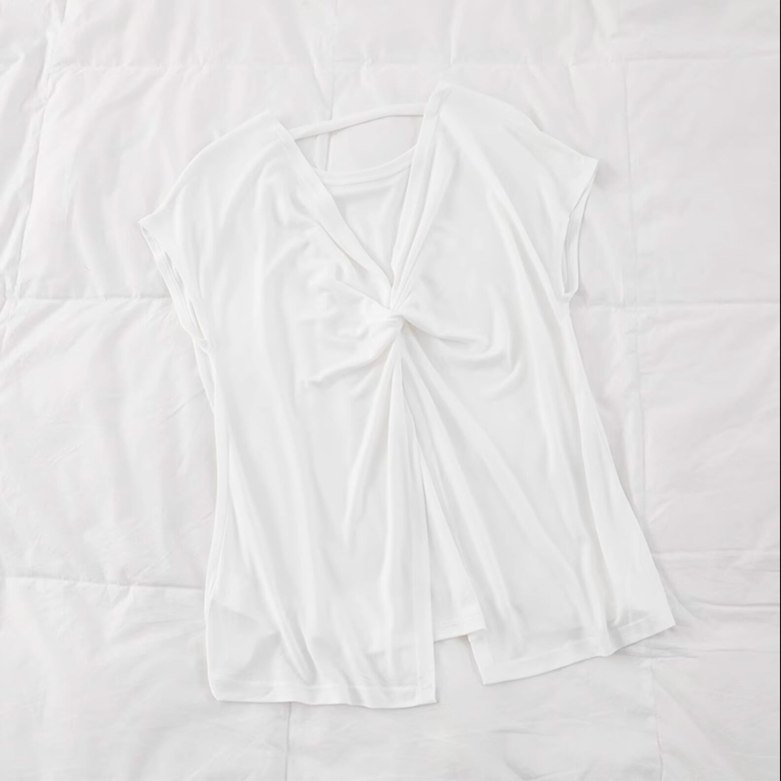 背中開きでフェミニンなデザインのトップスです。ドレープ感が美しいツイストデザインがポイントです。ヨガやダンスなどのスポーツウェアとしても活躍します。様々な場面で着回しのきくアイテムとして、ぜひお手元に置いておいてください。
