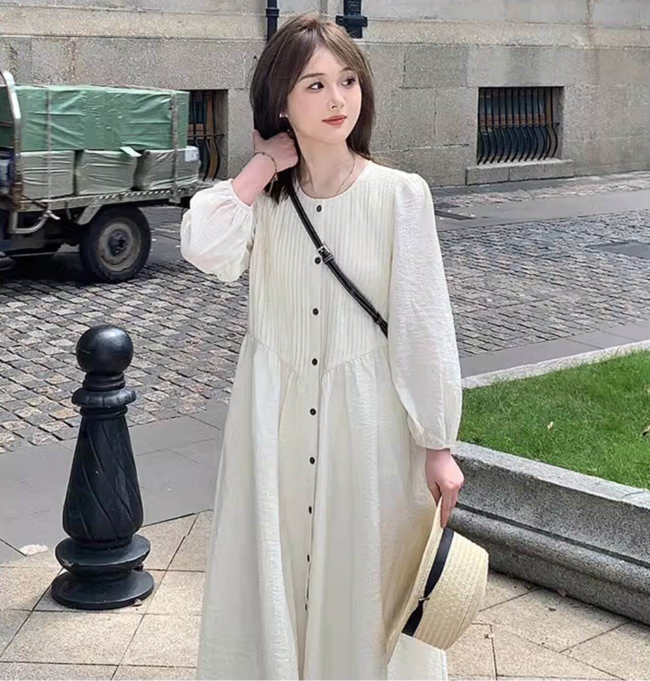 レディース ワンピース ロング 長袖 パフスリーブ ラウンドネック フェミニン 透け感 ボタン 切り替えデザイン かわいい 大人可愛い きれいめ シンプル カジュアル 上品 おしゃれ レトロ ラフ ガーリー ルーズ エレガント ラブリー キュート ナチュラル 無地 春 秋 ママ オフィス ビジネス OL 通勤 学生 デート お出かけ お泊まり イベント リゾート 旅行 公園 女子会 休日 バカンス カフェ 楽ちん 体型カバー 普段使い 着回し モテ 清楚 低身長 XS S M L アプリコット