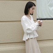 女性らしいペプラムデザインが大人可愛い長袖シャツ。Vネックなのでデコルテラインをきれいに見せてくれます。ネックレスとの相性も抜群。無地なので柄物のボトムスを合わせても◎スマートなシルエットのものを選ぶとコーディネートが綺麗に纏まります。