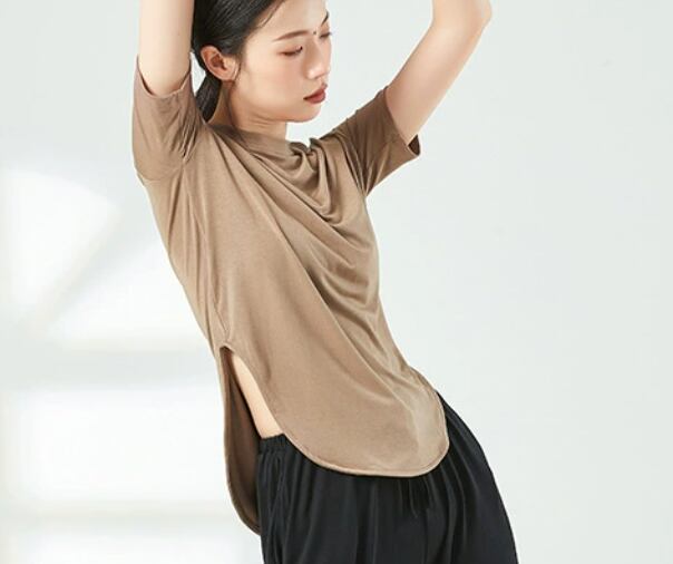 シックなカラーが大人可愛いシンプルな半袖Tシャツ。スリットが入っていてゆったりとした作りになっているので動きやすさ◎普段使いはもちろん、ダンスやストレッチの際に着用するのもおすすめです。