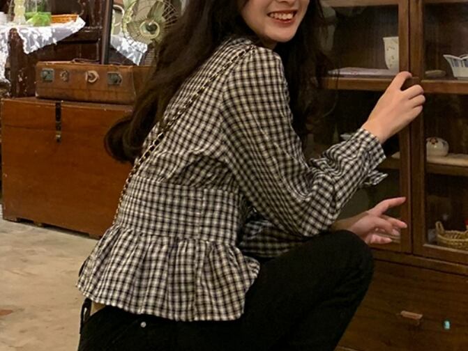 シックで大人可愛いチェック柄が魅力的な長袖のVネックシャツ。プルオーバータイプなので着脱が楽ちんなアイテムです。ウエスト部分がキュッと締まったペプラムデザインは女性らしいくびれを演出してくれてスタイルアップ効果も期待できます。スマートなシルエットのボトムスを合わせるとコーディネートが綺麗に纏まります。