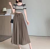シックな大人カラーが魅力的なクロップド丈のキュロットスカート。ワイドな作りになっているので足のラインを拾いにくく、ハイウエストタイプなので足をすらっと長く見せてくれるスタイルアップ効果も期待できます。シンプルなので着回し力抜群。トレンドのクロップド丈のトップスとも相性抜群です。