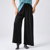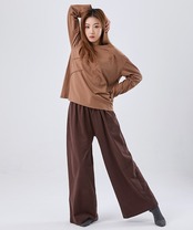 ヒップゆったりのシルエットでラクにはけるワイドレッグパンツ。ウエストドロストコード付きのハイウエストデザインで太ももやヒップを自然にカバーしながら足をまっすぐ・長く見せられるアイテムです。