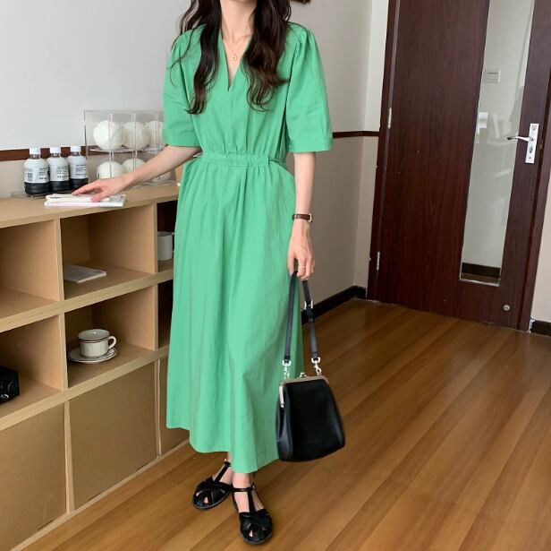 ワンピース フレアワンピース ロング丈 袖あり 五分袖 Vネック 襟なし フレア Aライン かわいい 大人可愛い きれいめ シンプル カジュアル 大人 上品 おしゃれ かっこいい 大人可愛い 大人女子 こなれ感 ラブリー キュート モダン 春 秋 10代 20代 30代 レディース 女性用 デート お出かけ 女子会 休日 着回し 普段使い 韓国系 コーデ スタイル フリーサイズ ピンク グレー グリーン