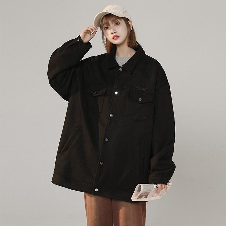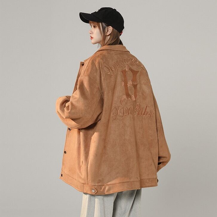オーバーサイズ バックロゴ刺しゅう レディース ジャケット アウター 上着 レザージャケット ミディアム丈 長袖 ドロップショルダー 萌袖 袖口ギャザー 襟付き バックコンシャス 前開き フェイクスエード シンプル カジュアル おしゃれ かっこいい こなれ感 ボーイッシュ ルーズ 無地 ロゴ 春 秋 ママ 女の子 学生 学校 通学 お出かけ 公園 休日 重ね着 体型カバー 普段使い 着回し レイヤード M L XL 2XL 3XL 4XL 5XL 大きいサイズ ゆったり ゆる ブラック ブラウン ピンク