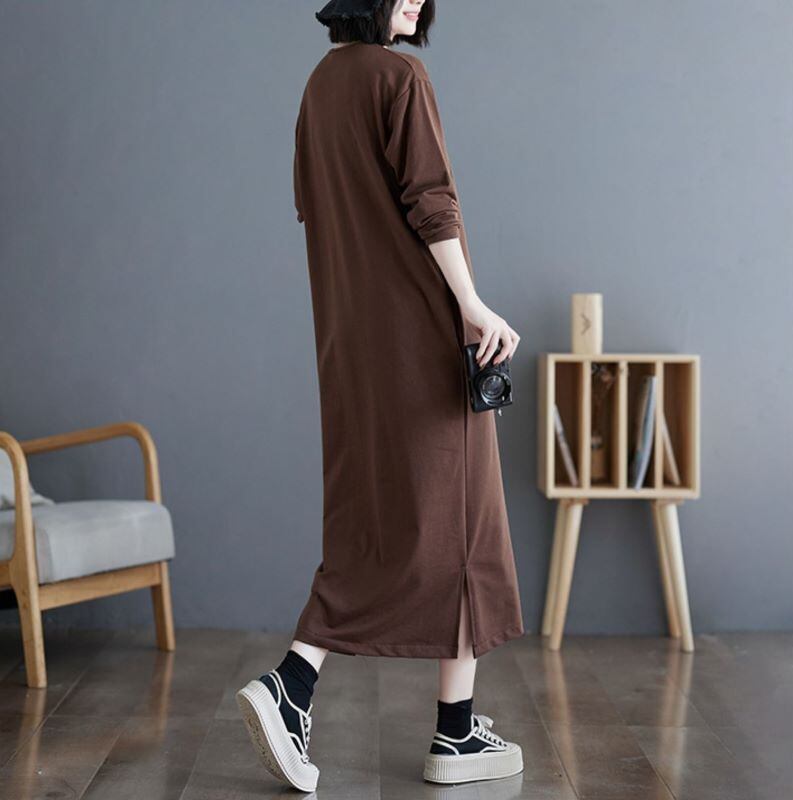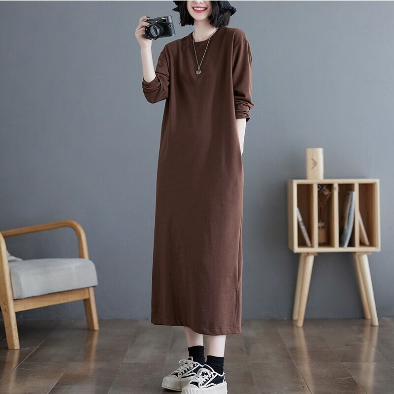 オーバーサイズ 色豊富 レディース ワンピース カットソーワンピ 膝下 ミモレ ロング 長袖 ドロップショルダー クルーネック 襟なし Iライン サイドスリット ポケット かわいい 大人可愛い シンプル カジュアル 上品 おしゃれ こなれ感 ルーズ ベーシック 無地 春 秋 ママ 学校 通学 お出かけ 旅行 休日 韓国 オルチャン コーデ 楽ちん 体型カバー 普段使い M L XL 2XL 大きいサイズ ゆったり ブラック ブラウン ライトグレー ベージュ カーキ ワインレッド アーミーグリーン カラバリ