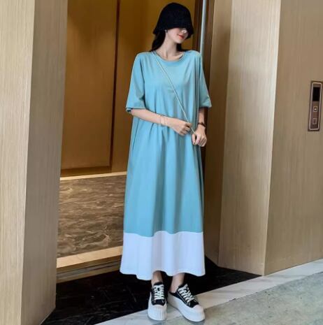レディース ワンピース ロングスカート ロング アンクル丈 半袖 Uネック ワイド Aライン バイカラー かわいい 大人可愛い きれいめ シンプル カジュアル おしゃれ こなれ感 ラフ ルーズ 無地 夏 デート お出かけ 休日 体型カバー モテ スタイルアップ L XL 2XL 3XL 4XL 大きいサイズ ビッグ ゆったり ゆる 水色 アプリコット