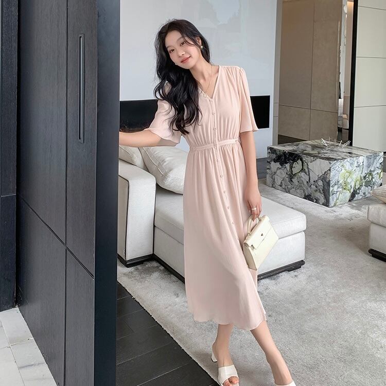 ワンピース 韓国風 オルチャン フレアワンピ Vネック シャツワンピ ロング ミモレ丈 袖あり 半袖 フレアスリーブ ウエストマーク スリム タイト 細身 ストレート Aライン 大人可愛い きれい シンプル カジュアル 大人 上品 おしゃれ お洒落 かっこいい 大人女子 大人カジュアル クール セクシー モダン 主役級 春 夏 秋 冬 オールシーズン サイズ展開 レディース デート お出かけ 女子会 休日 パーティー イベント 韓国 韓国系 ファッション コーデ スタイル モテ 美脚 脚長 カラバリ