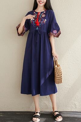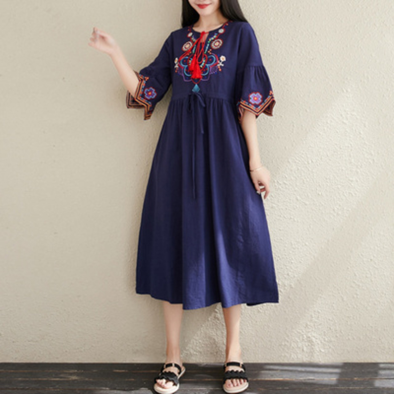 ワンピース ミモレ 7分袖 ラウンドネック 刺繍 ウエストマーク かわいい 大人可愛い シンプル カジュアル おしゃれ レトロ こなれ感 ラフ ガーリー ルーズ 個性的 モード系 モダン 主役級 存在感 とろみ感 抜け感 ヴィンテージ ラブリー 都会的 ラグジュアリー クラシカル カレッジ風 学生風 ベーシック アメリカン カントリー ロマンティック ナチュラル 無地 ロングシーズン リゾート 休日 バカンス 体型カバー 普段使い モテ 清楚 トレンド フリーサイズ ホワイト レッド ネイビー