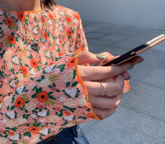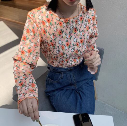 レトロな花柄模様が可愛い長袖トップス。落ち着いた色味なので子供っぽくなりすぎず大人可愛い印象に。シンプルな無地のボトムスを合わせるとコーディネートがまとまります。パンツスタイルでカジュアルダウンしても◎