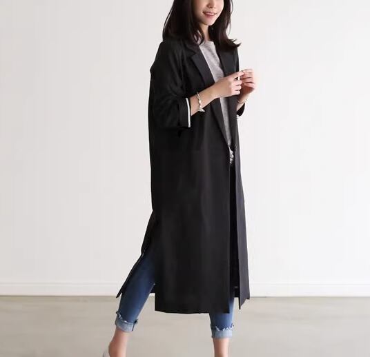 シックなカラーが魅力的なスーツ風のロングカーディガン。ボタンで前を留められるようになっているのでコーディネートや気温に合わせてスタイルを変えられるのもうれしいポイント。ゆったりとしたシルエットなので黒でも重たい雰囲気にならず優しげに仕上がります。