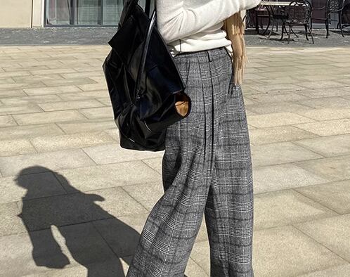 シックなカラー×チェック柄がレトロで大人可愛いワイドパンツ。ゆったりとしたシルエットなので足のラインを拾いにくく、ハイウエストタイプなのでスタイルアップ効果も期待できるアイテムです。タイトめのトップスを選ぶとコーディネートにメリハリがつき更にスタイル良く見せてくれます。
