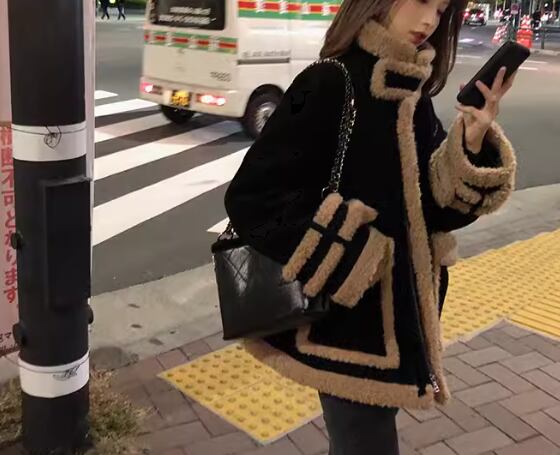 ブラック×ブラウンのシックな配色とスタイリッシュなデザインがおしゃれなもこもこアウター。厚手なので秋から冬にかけての寒い季節に重宝します。首まですっぽりとカバーできるスタンドカラーなのもうれしいポイント。上半身にボリュームが出るのですっきりとしたシルエットのボトムスがおすすめです。