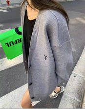 甘く可愛らしい印象を演出できる、ニットカーディガンです。前開きでボタンがついているため、脱ぎ着も簡単で便利です。シンプルなデザインでありながら、アルファベットのロゴ入りなのでおしゃれ感もアップします。さらに、ゆったりとしたビッグシルエットなので体型カバーもバッチリです。