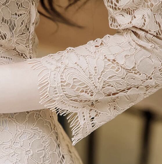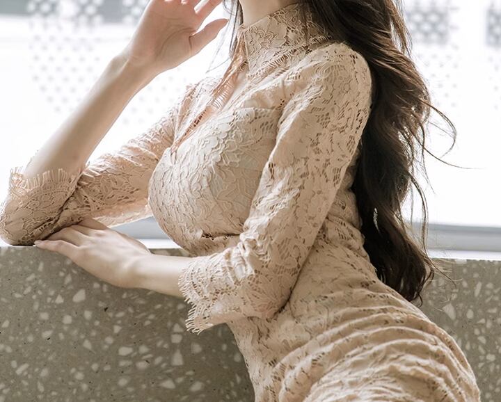 レディース ドレス レースドレス パーティー 演奏会 発表会 ステージ 舞台 キャバ 演劇 ラウンジ ナイトクラブ ミモレ 7分袖 Vネック スタンドカラー スレンダー タイト スリム 細身 ペンシルスカート レース ファスナー ハイウエスト 異国風 肌見せ 胸開き 可愛い きれいめ カジュアル 大人可愛い おしゃれ キュート ガーリー エレガント セクシー イベント ホテル レストラン 海外 ドライブ 夜景 バー 記念日 韓国 高見え モテ 20代 30代 春 秋 S M L XL 小さめ ベージュ